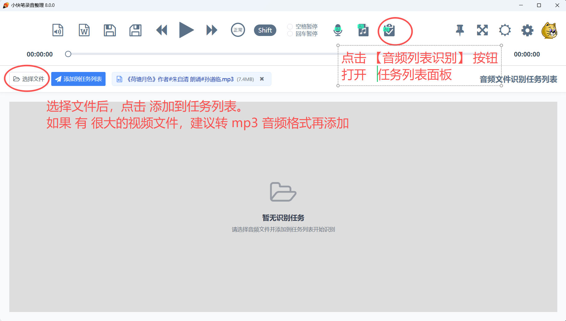 选择文件按钮,并添加到任务列表 - 如果有大视频文件,建议转mp3音频再上传。