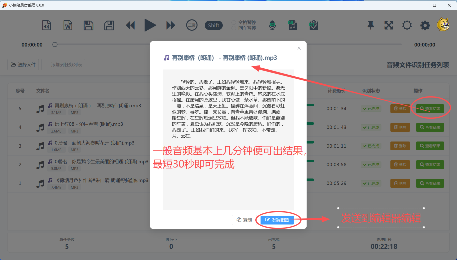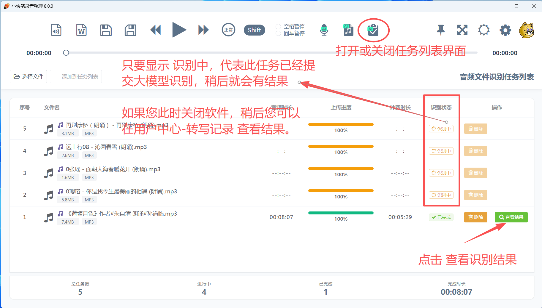 - 提交识别任务后,一般很快即可获得结果。实际时间取决于音频文件大小和数量。您只需24小时内到