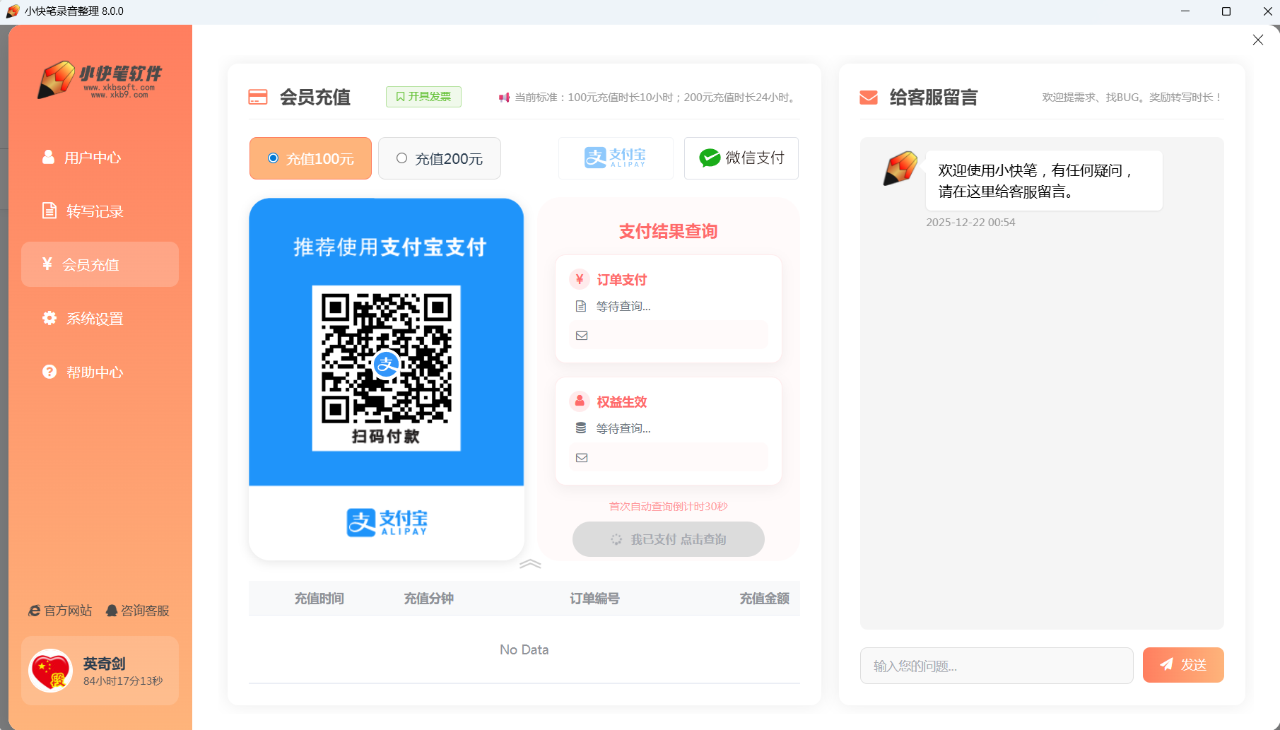 💡 打开用户中心 会员充值 界面,选择充值金额,扫码支付。充值成功后,时长将自动到账。